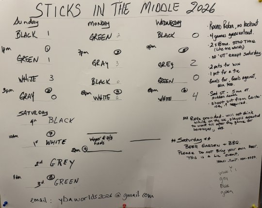 After a few fun games playoffs are set for Saturday. First seed team White takes on fourth place team Black at 10:00am, followed by second seed team Grey against third place team Green at 11:00am. Winners face off in the finals at 2:00pm.